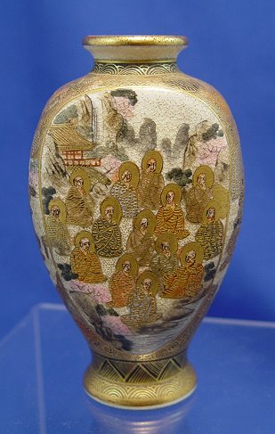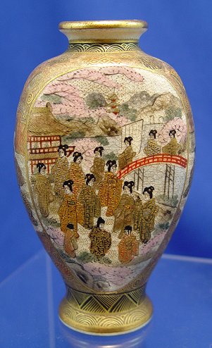 SIGNED DIMINUTIVE JAPANESE SATSUMA VASE: Hand painted with scenes of Scholars, Gods, and Geisha. 5''h.