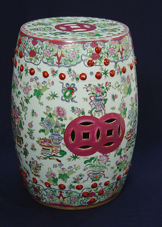 POLYCHROME ORIENTAL GARDEN SEAT: In the colors of Rose Medallion. Character marks on the underside. 19 1/2''h.
