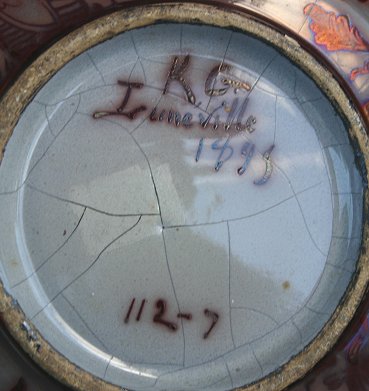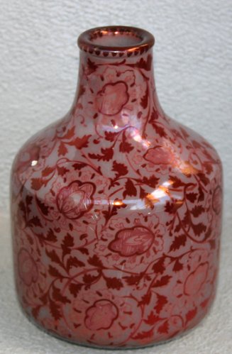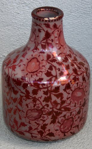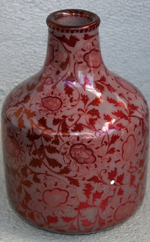 RARE AND UNUSUAL KELLER GUERIN INCISED PAISLEY DECORATED VASE: 8 1/2'' h., metallic raspberry luster and muted reds with a cream gun metal ground, underglaze marking KG Luneville, 1895, several abrasions and several nicks to the glaze, repairable.