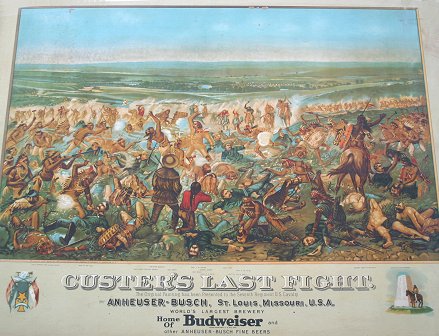 EARLY 20TH CENTURY LITHOGRAPH DEPICTING CUSTER'S LAST FIGHT: An advertising print from Anheuser-Busch Beer Company, sight size 32'' x 42 1/4''. Condition - Several areas of spotty mold, water damage in the right margin, upper margin has several scrapes with paper loss. Sold as is.