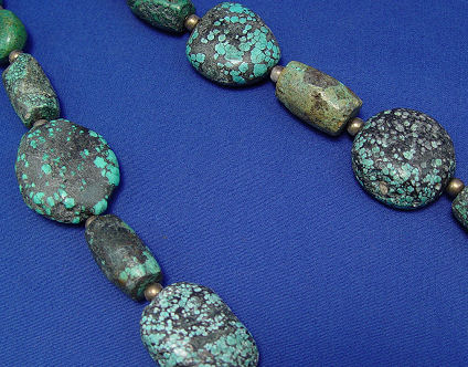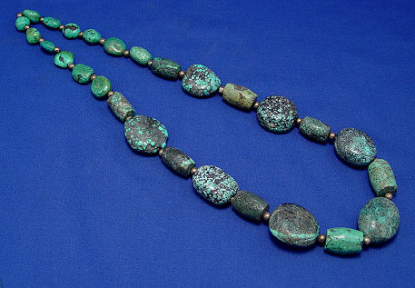 32'' TURQUOISE BEAD NECKLACE: Large nuggets of roughly polished turquoise, mostly blue, graduating in size, strung with small brass beads, 379 grams.