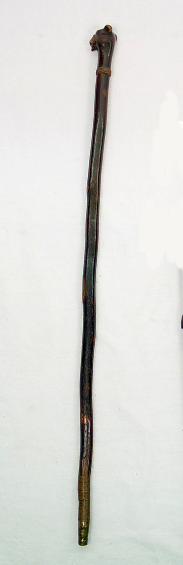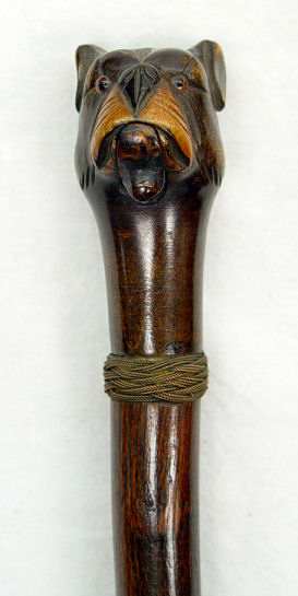 DOG HEAD FIGURAL CARVED WALKING STICK: Mechanical mouth, glass eyes, carved in the form of a boxer type dog head, metal tip. 33'' long.