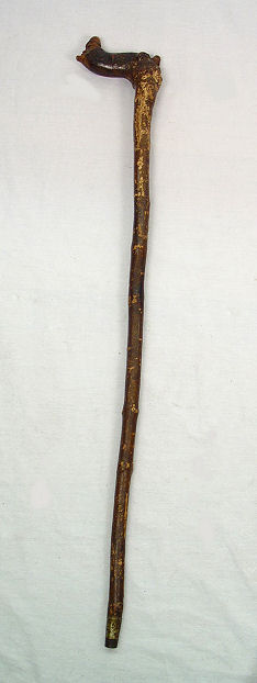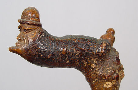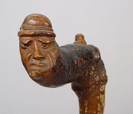 FOLK ART FIGURAL CARVED WALKING STICK: In the form of a mans face on one end, full bodied monkey on the other. The face has glass eyes. 36'' long.