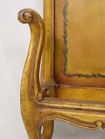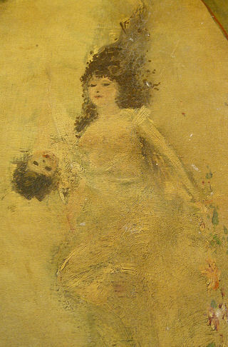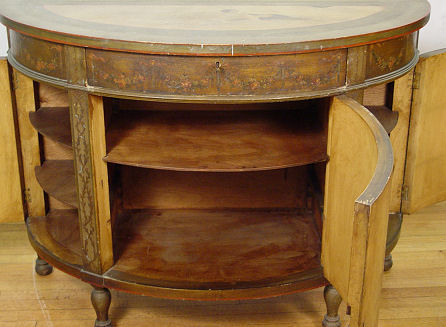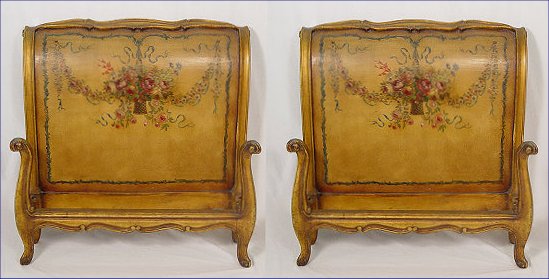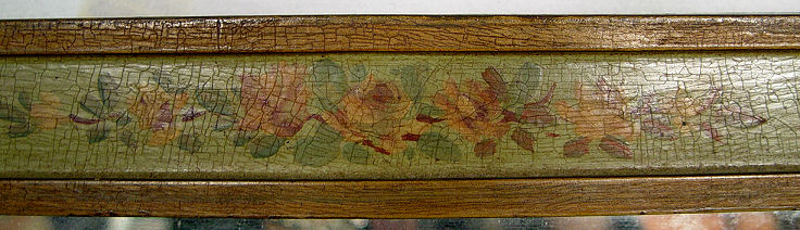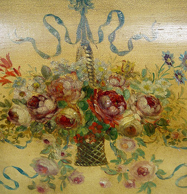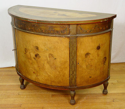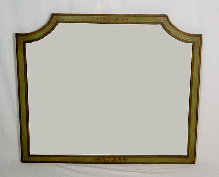 1920's PAINT DECORATED CHEST AND PAIR OF TWIN BEDS: The bow front chest is painted in cherubs and figures, the beads are floral decorated. Headboards are 38''h. The chest is 36''h. x 50'' x 21''. Paint decorated mirror is also included.
