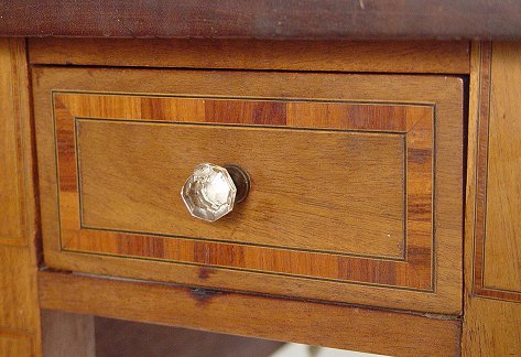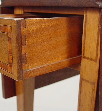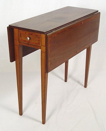 DIMINUTIVE BANDED MAHOGANY DROP LEAF TABLE: A drawer at each end, raised on tapered legs. 27 1/2''h., x 12 1/2'' x 30''. With leaves extended the table opens to 30'' x 30''.