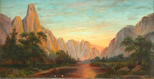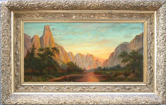 AMERICAN SCHOOL WESTERN RIVER CANYON LANDSCAPE WITH CATTLE: O/B, No visible signature, 7 1/2'' x 14 1/2'', in the style of Sanford Robinson Gifford of Hudson River School fame, encased in embossed foliate motif period frame, shows wear, 12'' x 19''.