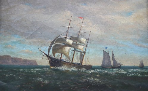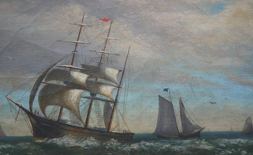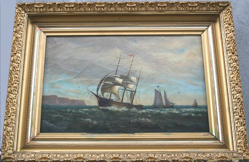 GOOD 19TH CENTURY AMERICAN SCHOOL MARITIME PAINTING: Depicting sail boats off the coast, probably New England, O/C, 14'' x 22'', encased in period gilded gesso frame with wear over paint and missing gesso, 21 1/2'' x 29 1/2'', signed lower left E.H.Powers(?).