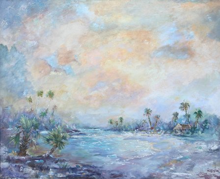 PRICE, Hartley, (American, 20th C.): Tropical river landscape, O/C, 27'' x 33'', unsigned, encased in an antiqued carved frame with damage and missing gesso, 35'' x 41''. Condition - Several abrasions, small portion of missing paint.