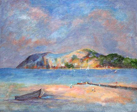 PRICE, Hartley, (American, 20th C.): Tropical paradise, O/C, 20'' x 24'', unsigned and unframed.