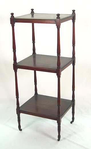 CHAREK MAHOGANY THREE TIER SHELF CA. 1935: Bears the Charek label. Metal casters. 43 1/2''h. x 17''x 14 3/4''.