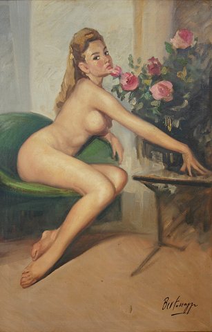 BERTONAZZI, G., (European, 20th C): Female nude with bouquet of roses, O/C, 26'' x 24'', signed lower right. Condition - Needs cleaning, small tear in lower margin.