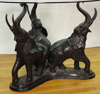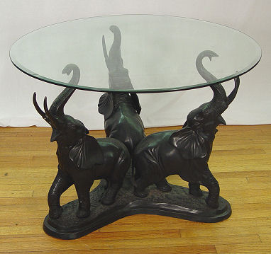 WHIMSICAL BRONZE ELEPHANT GLASS TOP TABLE: Bronze base of 3 elephants with trunks uplifted to hold the glass top. 28 1/2'' tall x 39 1/4'' dia.