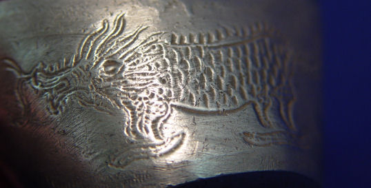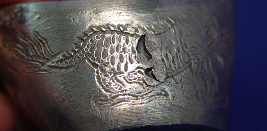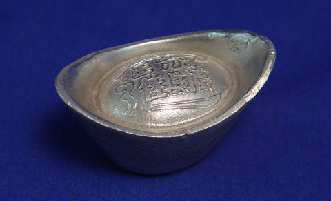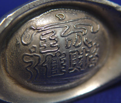 CHINESE SILVER TRADING INGOT SYCEE: Approx. 300 grams, decorated with dragons and symbols to top meaning ''good luck on making money'', four character mark to base, approx. 9.5 oz., purported Qing Dynasty.