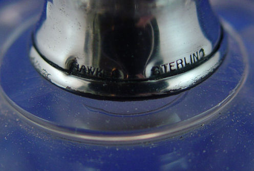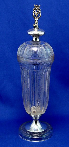 HAWKES STERLING MOUNTED CUT CRYSTAL COVERED VASE: Panels of cut and frosted glass. Sterling stem and finial. The figural nude finial is impressed ''Hawkes Sterling''. 16''h. overall. Glass is free of chips or cracks.