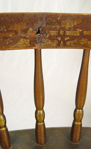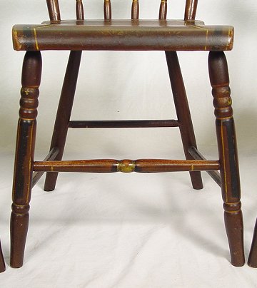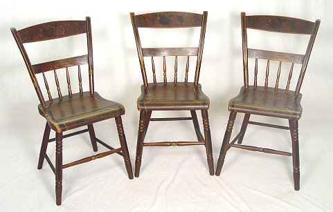 3 PAINT DECORATED THUMB BACK WINDSOR CHAIRS: American Country Sheraton-Windsor side chairs. Hand painted matched set of three. 32''h. x 15''w. the seat is 17'' from the floor. Please call for condition.