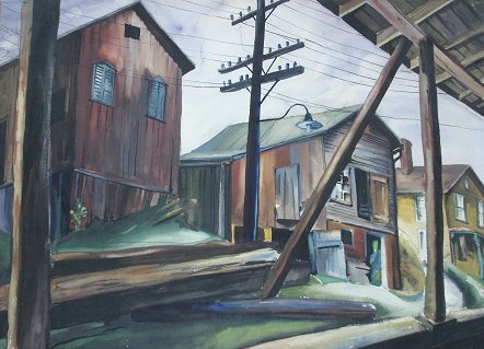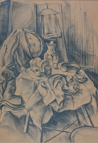 BENNETT, Frederick, (American, 20th C): 2 Piece art lot to include a watercolor street scene, 22'' x 31'', and a pencil Drawing of a still life with table, fruit, cookware and garments, 22 1/2'' x 15 1/2''