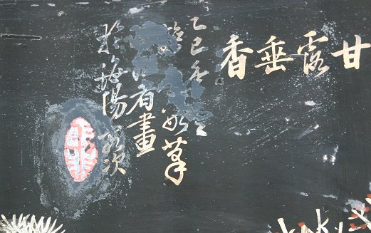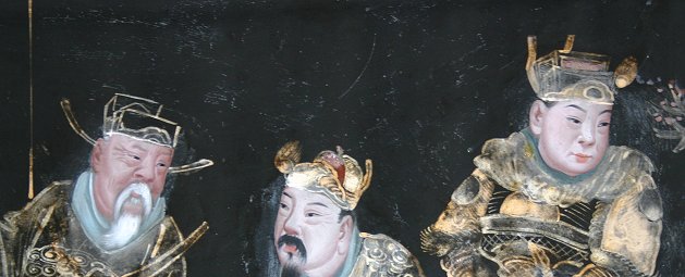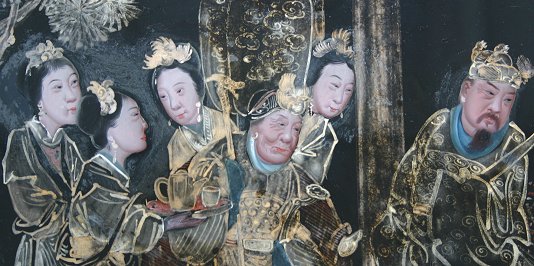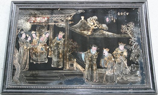 19TH C? ORIENTAL REVERSE PAINTING ON GLASS DEPICTING ELDERS AND FOLLOWERS IN A RITUAL TYPE SCENE: 20'' x 30'', signed upper right, several areas of paint flake and missing paint along the margins, sold as is, encased in an ebonized frame with beaded molding.