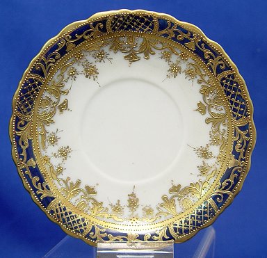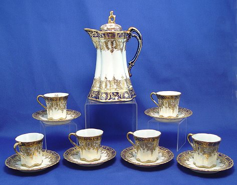 COBALT DECORATED NIPPON CHOCOLATE SET: Heavy with gold ornamentation, the set includes chocolate pot, 6 cups and saucers. Oriental China Nippon mark. Very minor gold wear.