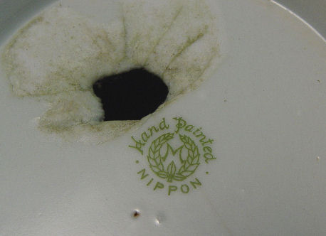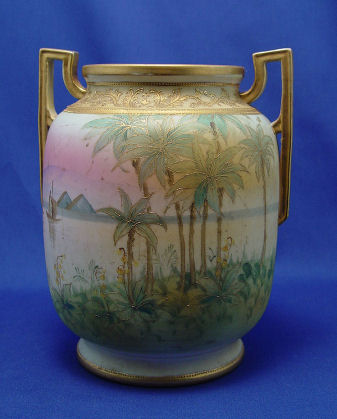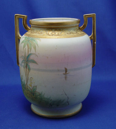 NIPPON PALM TREE SCENIC VASE: Hand painted landscape featuring palm trees in the foreground, backed by water and mountains. Later off center hole drilled for lamp. Marked for Morimura Bros. 8 1/2''.