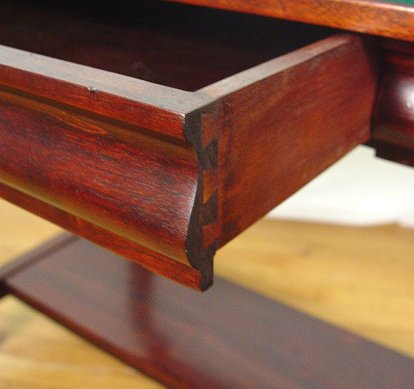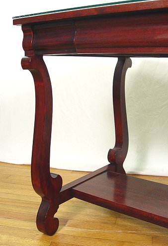 EMPIRE STYLE MAHOGANY LIBRARY TABLE: One drawer table, scrolled legs, support shelf. protected with a glass top. 30''h. x 40'' x 26''. Early 20th C.