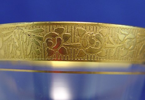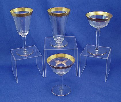ELEGANT GLASS GOLD RIM STEMWARE: 18 pieces to include 6 goblets 5 1/2'' tall, 3 champagnes 5 7/8'' tall, 6 wine 6 3/4'' tall, 3 sherbert 5'' tall.