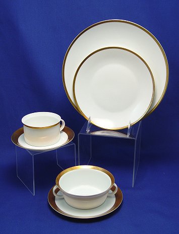 CLASSIC GOLD RIMMED ROSENTHAL FINE CHINA SERVICE: 45 pieces to include 11 dinner plates, 10 cream soups bowl with underplates, 8 cups and saucers, 11 bread plates, gravy with underplate, two platters, 15 3/4'' and 17 1/4'', creamer and sugar.