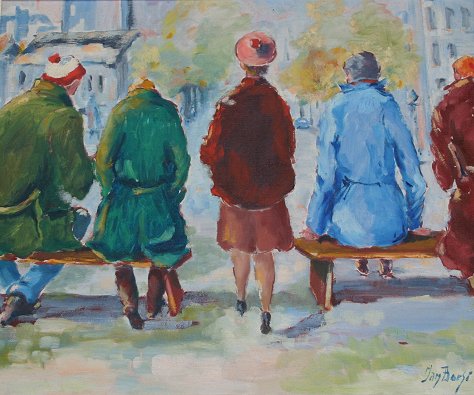 BORZO, Jan, (European, 20th C): ''Waiting for the Bus'', O/C, 20'' x 24'', signed lower right, period gilt molding with wear, 25 3/4'' x 29 3/4''. Condition - Some minor paint fleck, needs cleaning.
