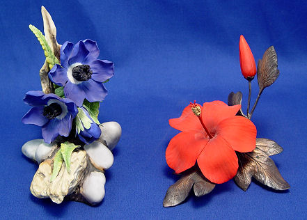 2 BOEHM PORCELAIN FLOWERS: Blue Anemone, 5 1/8'' and a red Hibiscus, 4''h.