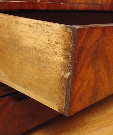 LOUIE PHILLIPE CROTCH GRAIN MAHOGANY COMMODE CA. 1840'S: 5 drawer chest with bottom drawer hidden in the design of the piece. 38 1/2''h. x 49'' x 21''. Please call for condition.