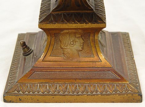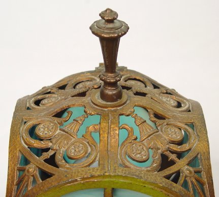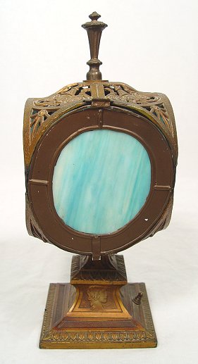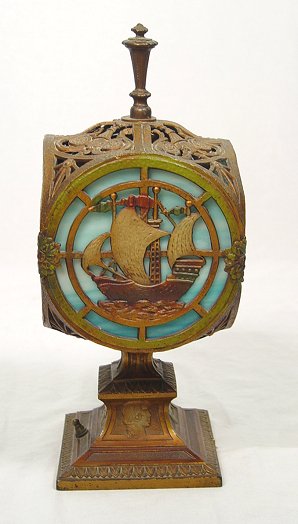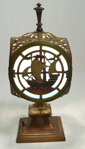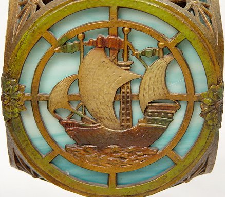 VINTAGE 1920'S TABLE LAMP: Tall ship motif filagree, polychrome metal over blue slag glass. Single bulb, turn switch. 16''h, 7''w.