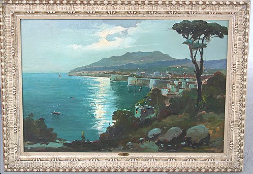 SALVATI, T. (Italian, 20th C): Nocturnal coastal scene of Amalfi, O/C, 24'' x 36'', antiqued white washed carved frame, 30'' x 42''.
