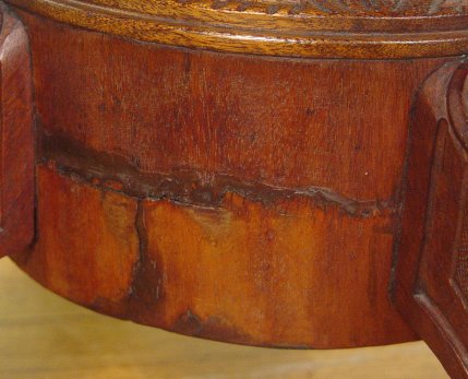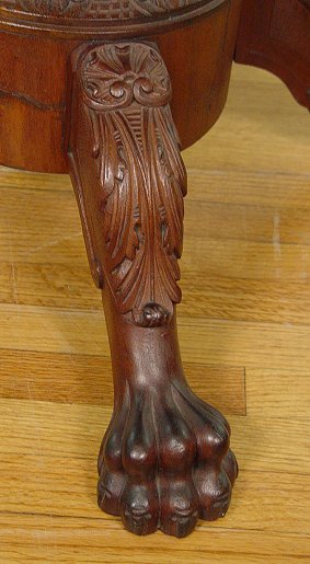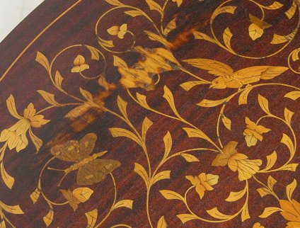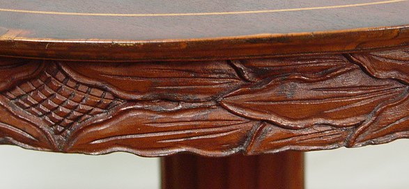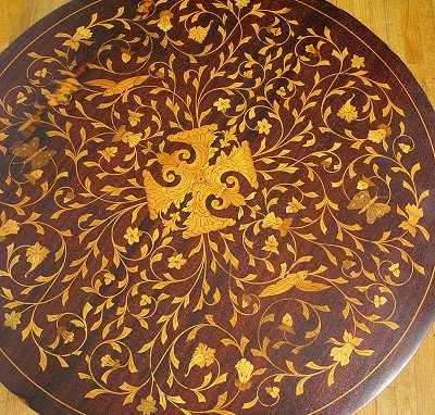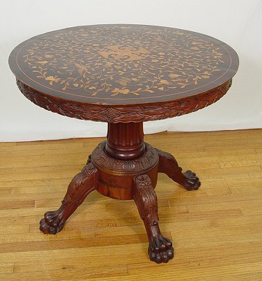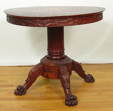 RICHLY CARVED PARLOR TABLE WITH DUTCH MARQUETRY INLAID TOP: 19th century, 29 1/2''h x 36'' dia. Please call for condition.