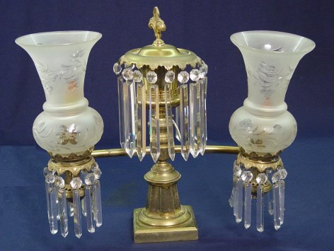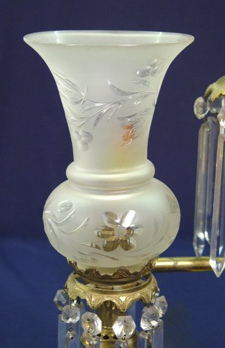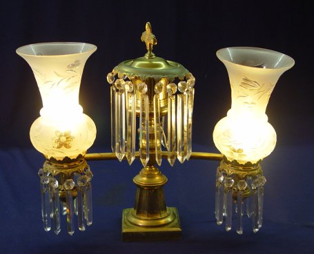ARGAND BRASS LAMP WITH ETCHED GLASS SHADES: Two light Argand type brass lamp hung with fine crystal prisms. The shades are etched. Please note 5 of the 5 1/2'' prisms are lacking. 16''h x 20 1/2''w.
