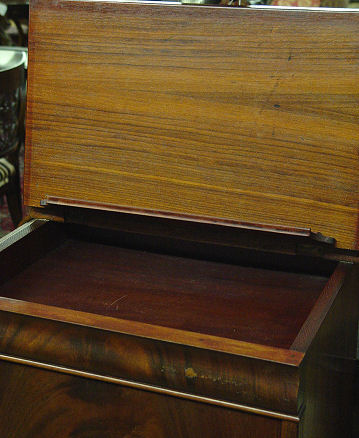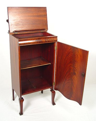MAHOGANY MUSIC CABINET / STAND: Single flame grain mahogany door and mirror backsplash. Top lifts to convert cabinet into a music stand. Replaced interior shelf. 49''h. x 20 1/2'' x 15''.