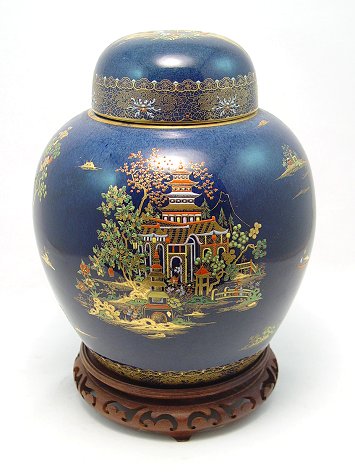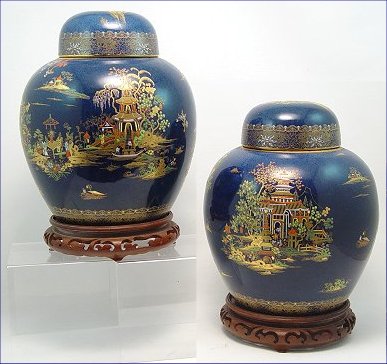 PR OF WILTSHAW & ROBINSON CARLTON WARE TEMPLE JARS: Enameled and gilt oriental design on blue ground. Very unimportant gold loss where the lid meets the jar. Free of chips or cracks. 10 1/2''h. Sold with carved wooden bases.