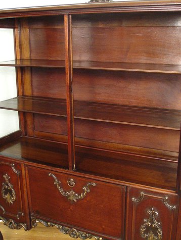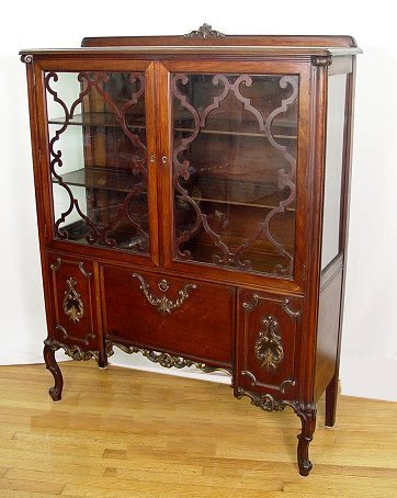 LATE 19TH C MAHOGANY CHINA DISPLAY CABINET: Glass front and sides, interior shelves have plate grooves, the bottom center has a fall front. Carved scrolled legs. 62''h. x 47'' x15''. Est. $600/800**