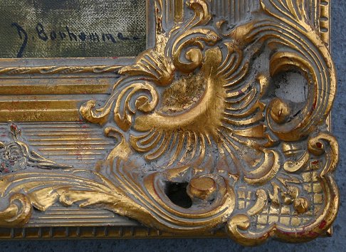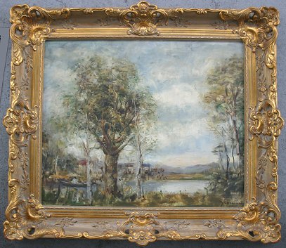 BONHOMME, D., (European, 20th C): Lakeside scene with figure in a boat and village in the distance, O/C, 20'' x 24'', signed lower right, encased in immaculate pierce carved and gilded Belgian frame, 27'' x 31''.