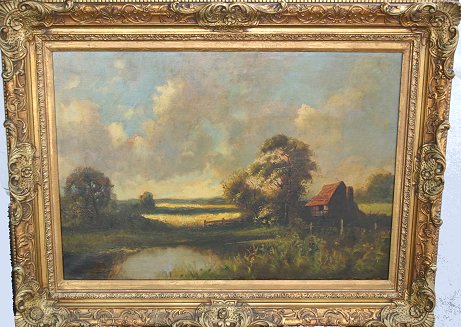 LEWIS, Walter?, (European, 20th C): Country landscape with cottage by a stream, O/C, 20'' x 30'', signed lower left, encased in a heavily carved and gilded frame with wear, 28 1/2'' x 36 1/2''.