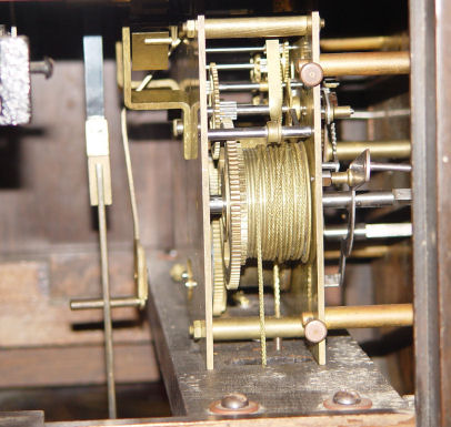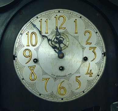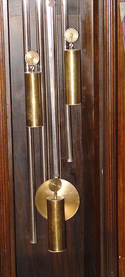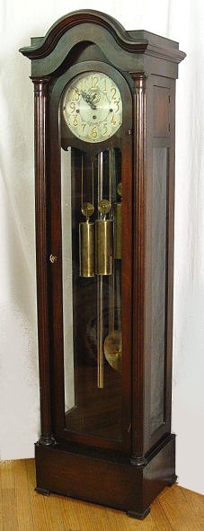 JACQUES MAHOGANY TALL CASE GRANDFATHERS CLOCK: Molded and arched top, fluted stiles. The dial is signed Jacques. 3 weights, 4 pipes chimes. 74 1/2''h. x 14'' x 20''.
