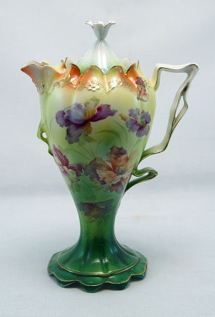 RS PRUSSIA CHOCOLATE POT: RS Steeple Mold 12, 10 1/2''h. Unsigned, the molds are shown in Marples ''RS Prussia, The Art Nouveau Years'' page 120-121. Free of chips or cracks.