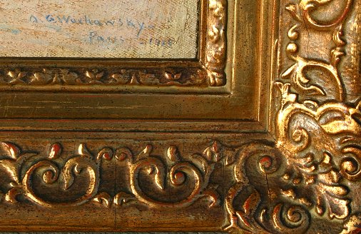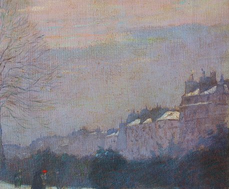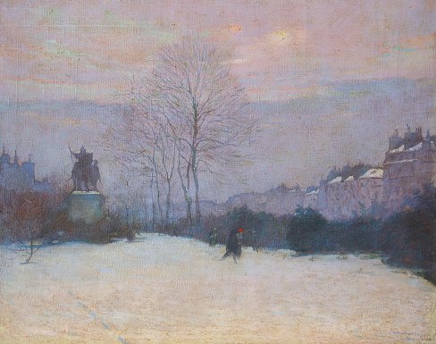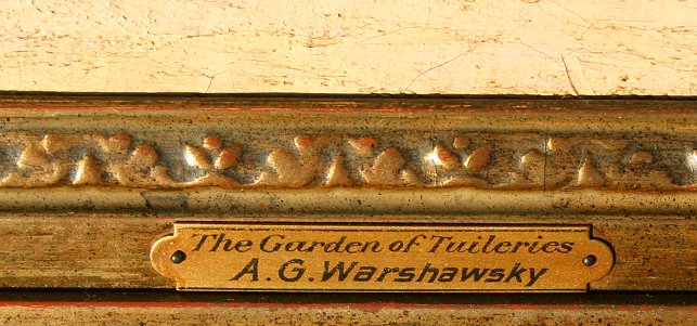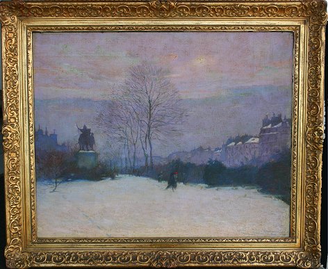 WARSHAWSKY, Abel George, (American, 1883-1962): ''Garden Of Tuileries'', winter scene with figures, O/C, 26'' x 32'', signed lower right, dated ''Paris 1918'', period gilded gesso frame with wear, 32 1/2'' x 39''. Condition - Needs cleaning, minor cracklure. Est. $10000/20000**
