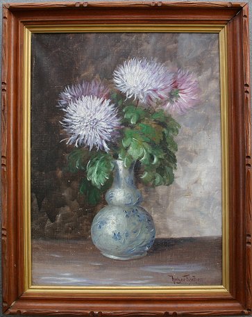 FISCHER, Holger, (Danish, 1889-?): Chrysanthemums in a blue and white double gourd vase, O/C, 22 1/4'' x 16 3/4'', signed lower right, carved worn frame, 26 1/4'' x 21''. Condition - Several abrasions, minimal paint loss, needs cleaning.