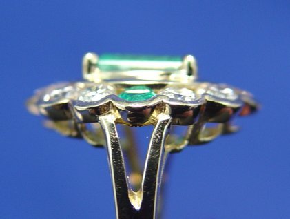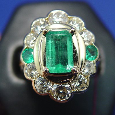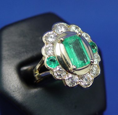 LADY'S EMERALD AND DIAMOND RING: Centered by an approx. 1.3ct clear green emerald, surrounded by round cut diamonds, approx. 1.8ctw, estimated color H/I and clarity I, interrupted by two smaller round cut emeralds approx. 13pts each, set in 14k yellow gold. Size 7.75, 6.2 grams. Est. $2500/3000**