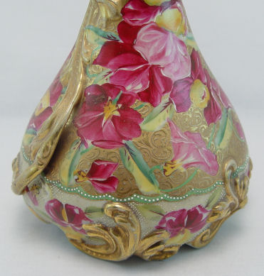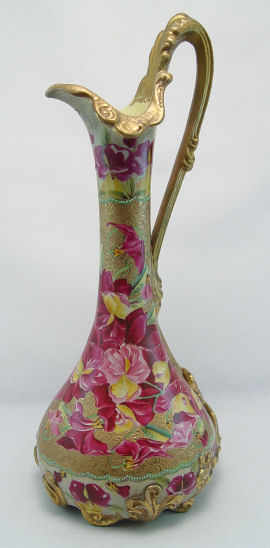 LARGE ROSE DECORATED NIPPON EWER 16''h.: Bold hand painted rose design with enamel dotting and gold scroll work. Please call for Condition.