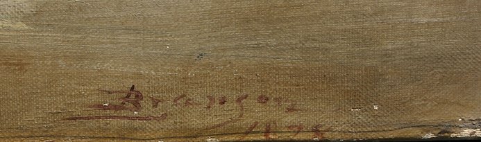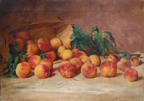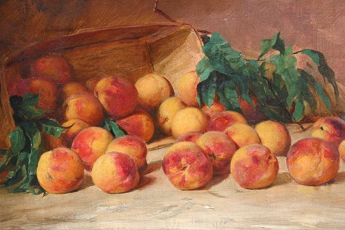 BRANSON, Lloyd?, (American, 1861-l925): Still life of peaches, O/C, 17'' x 24'', signed lower right Branson and dated 1898, encased in a period frame with extensive wear, damage and missing gesso, 22'' x 30''. Condition - Needs cleaning, several areas of paint fleck and craquelure, minor abrasions.