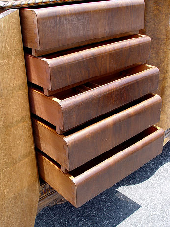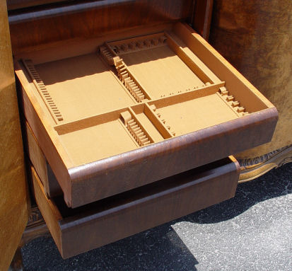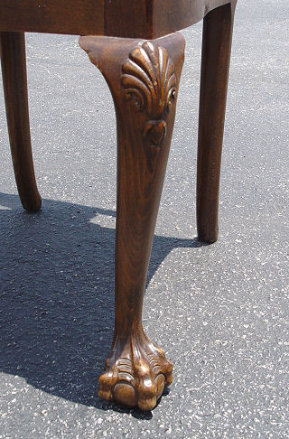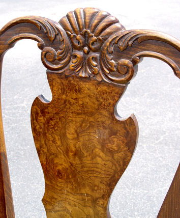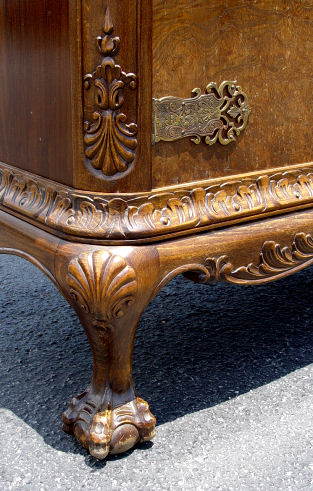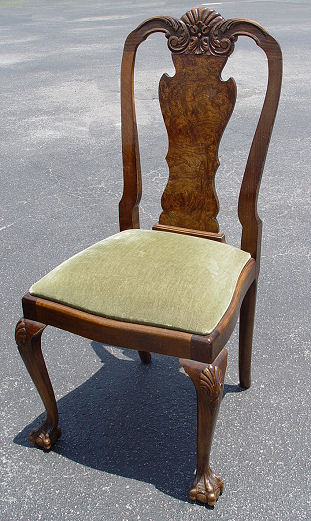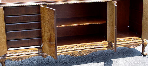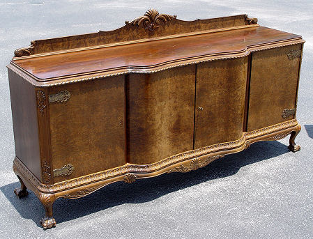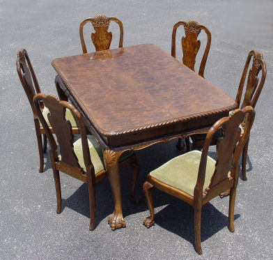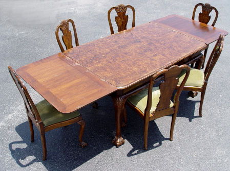 BURLED WALNUT 9 PC CARVED DINING SUITE: Includes draw leaf TABLE with gadroon edging, acanthus leaf carvings on the cabriole legs, and carved paw feet, 59''l x 39''h, with leaves extend to 105'', 6 CHAIRS with carved crests, carved paw feet on the front legs, 39 1/2'' h., the matching glass front and side CHINA CABINET 74'' h. x 48 1/2'' x 19 1/2'', and the generously proportioned SIDEBOARD with linen and silver drawers, 49 1/4'' h.(with backsplash) x 92'' x 25''. Est. $5000/6500**