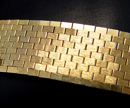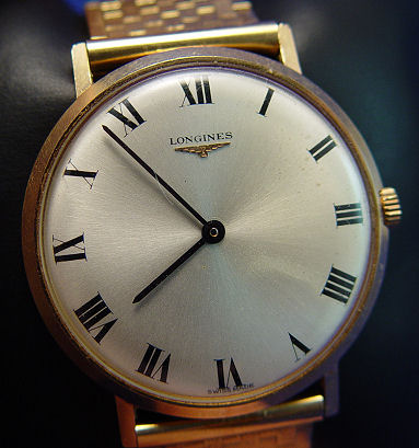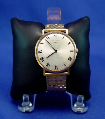 GENTLEMAN'S LONGINES 18K GOLD WRIST WATCH: Cream dial with black Roman numerals, 17 Jewel works serial #13747042, circa 1966, cal 428, inside back case marked Swiss Made 18k 750 7687 5 62. Currently keeping time, on an 18k gold mesh band marked 750 ?58VI, adjustable clasp, 6 1/2''l. overall.
