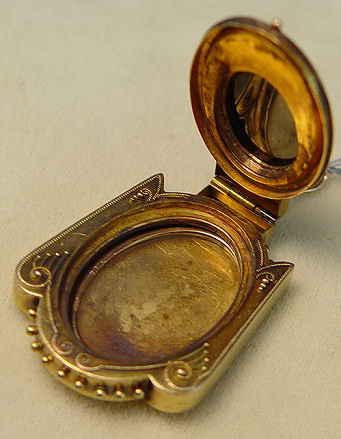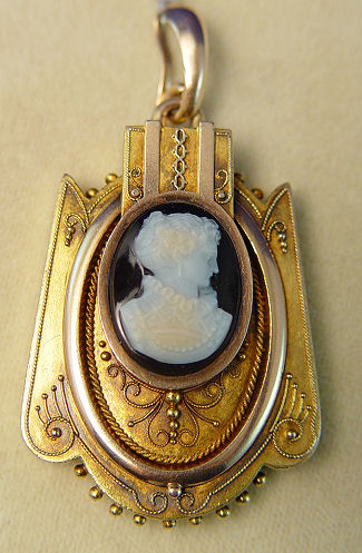 14K VICTORIAN MEMORIAL CAMEO HAIR LOCKET: Delicately designed pendant with bead and wire work decoration, cameo with royal profile tops the hinged opening with space under for your momento or loved one's hair. Assays 14k, approx. 1 3/4'' x 1 1/4'', 2 1/4''l with bail, 16 grams. Est. $800/1000**
