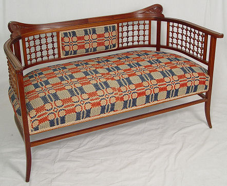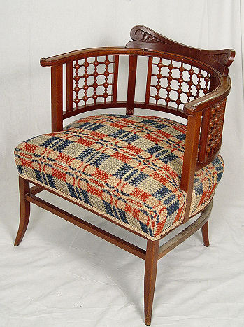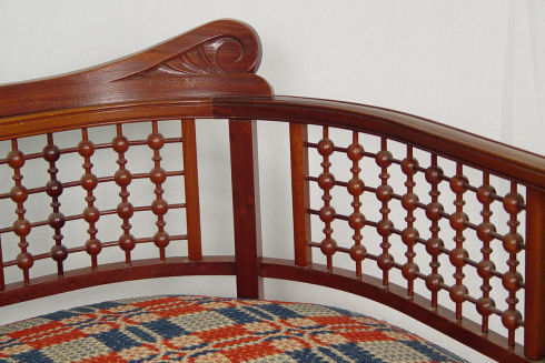 VICTORIAN STICK AND BALL SETTEE AND CHAIR COVERED IN JACQUARD: Continuous arm bow back settee and matching chair. The settee is 29''h. x 49''l. x 23'' deep.