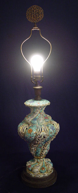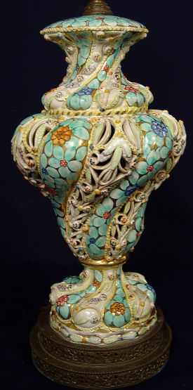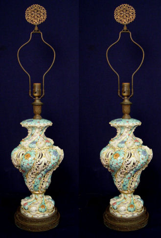 PAIR OF ITALIAN CERAMIC TABLE LAMPS: Gaily colored polychrome glaze. probably Capo-di-monte. Porcelain portion is 16''h, lamps are 33''h. overall.